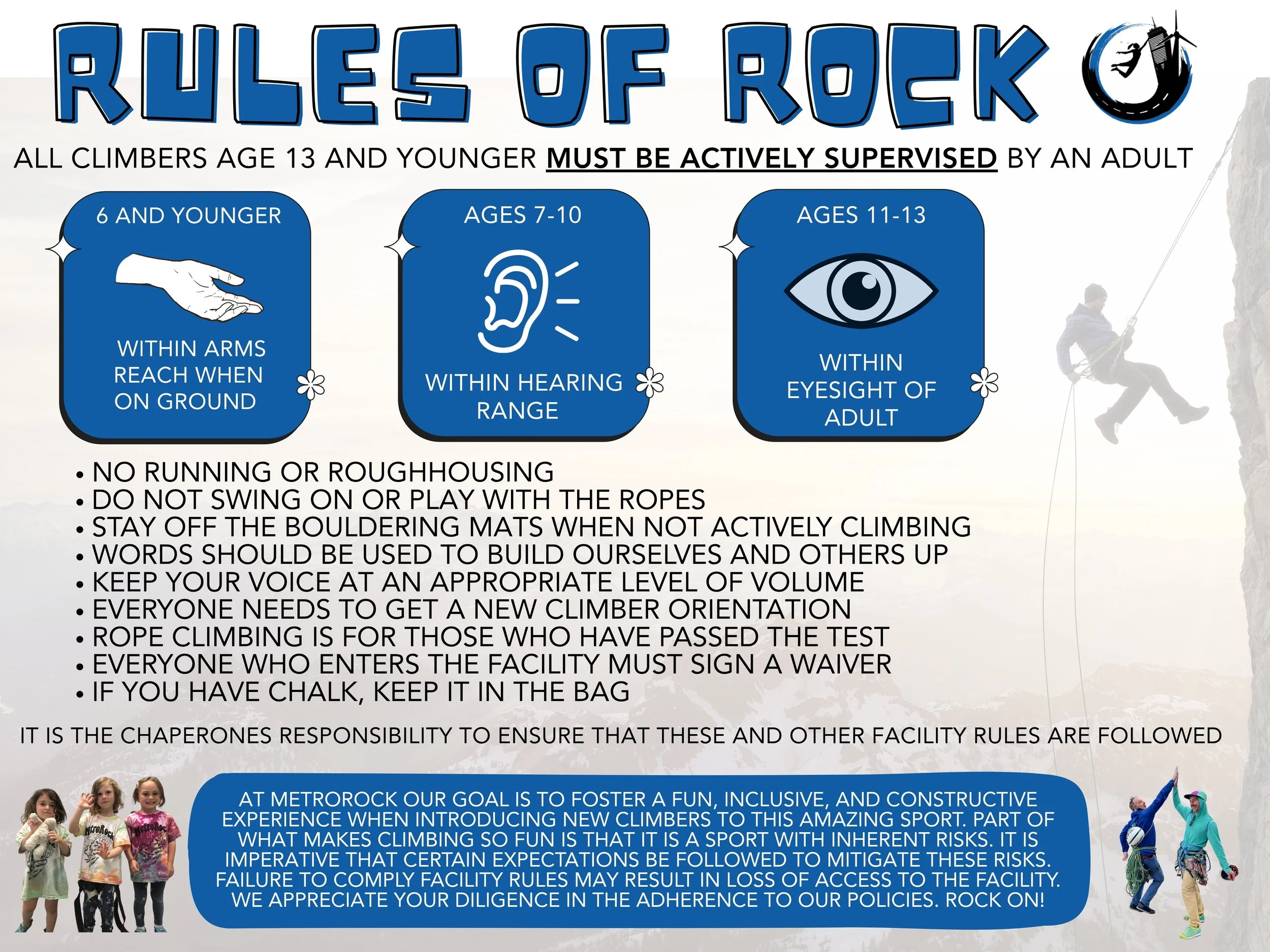Each night of the week we offer discount access to a different group within our community. Mon -Thur Discount Day Passes are $20, Friday is pay your age for 12 Under, normal rate for 12 and up. Discount Pricing starts at 3pm and does not include gear. If you are planning to attend for family night with a group of more than 6 climbers please email NBPT@metrorock.com